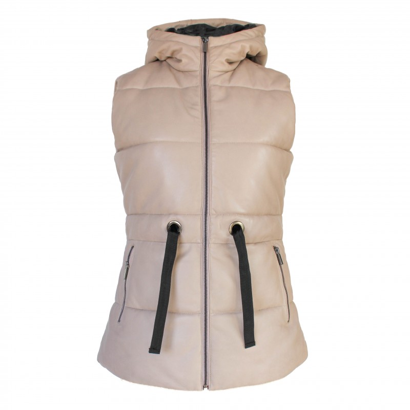 Colete de pele acolchoado com capuz e laço