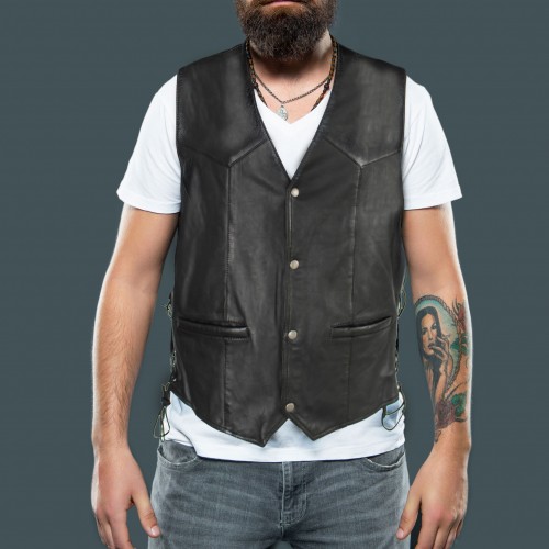 Colete de couro com bolsos e atacadores laterais