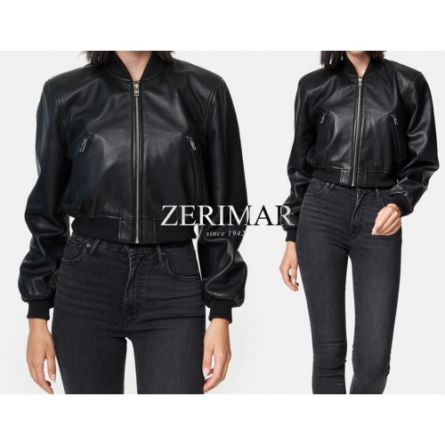 Jaqueta bomber curta de couro com zíper modelo MITES