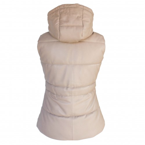 Chaleco hecho de piel natural. Tiene un cierre con cremallera delantera y dos bolsillos laterales con cremallera.